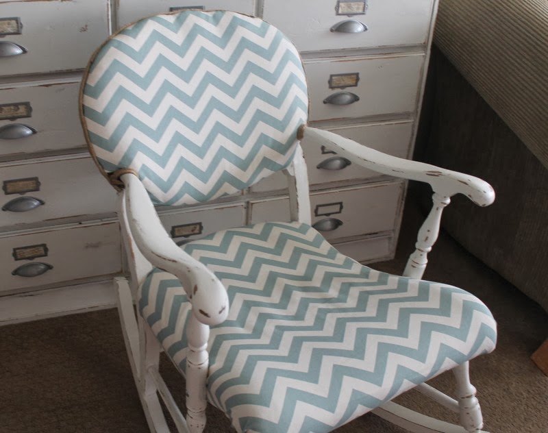 Vintage Blue Chevron Rocking Chair with fishtail braided jute detailing.